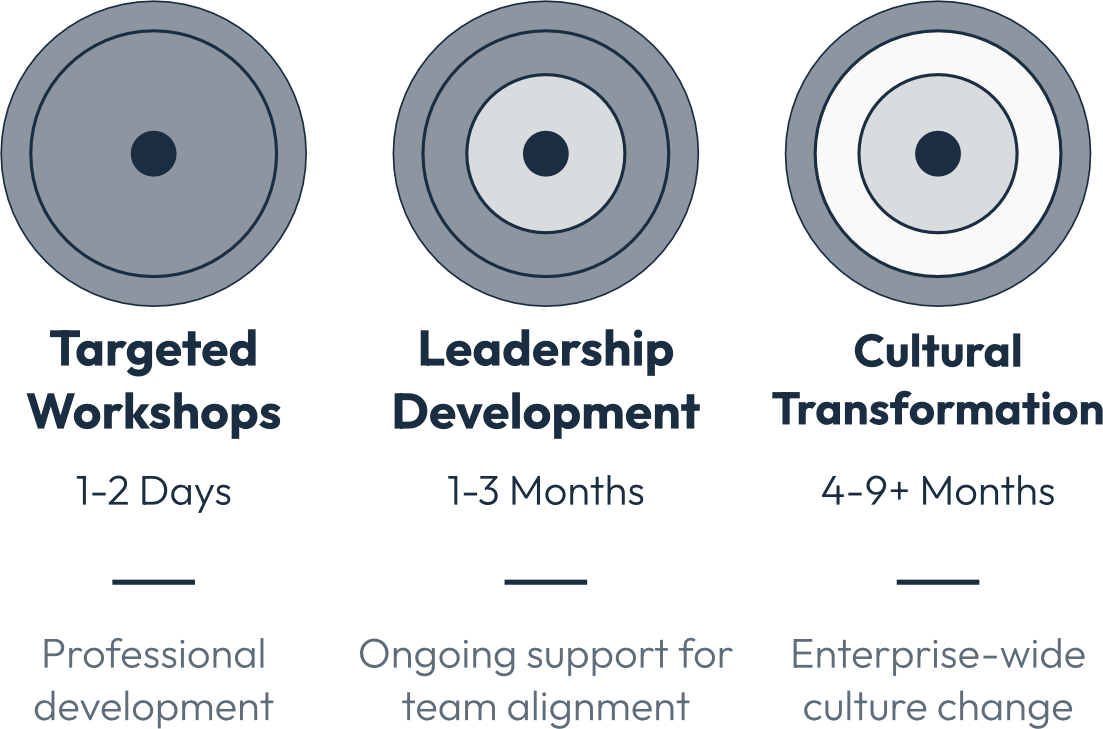 Our consulting work shows up in a single room at a time. Our education programs take the same frameworks — the same shared language, the same structured practice — and make them available to leaders across an institution. Two programs, two formats, one conviction: that leadership is built through practice, not delivered through content.
